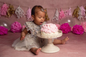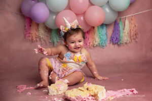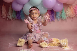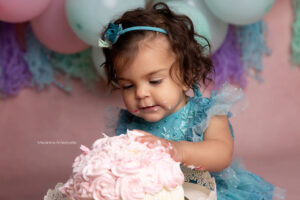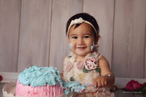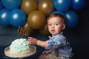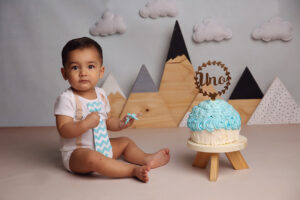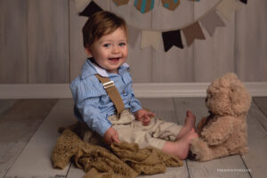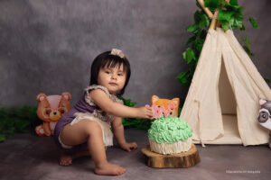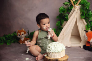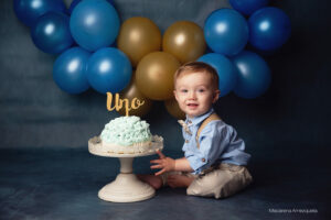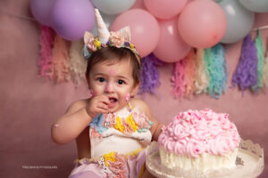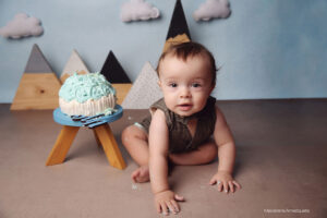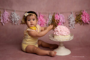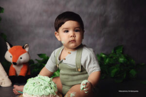Todo el proceso de trabajo que realizo es a través del juego y la exploración de parte de tu bebé. Charlamos, cantamos, bailamos. Los niños son muy curiosos y aman que jueguen con ellos. Independientemente del paquete que elijas vamos a trabajar primero fotos sin torta y luego hacemos el smash cake.